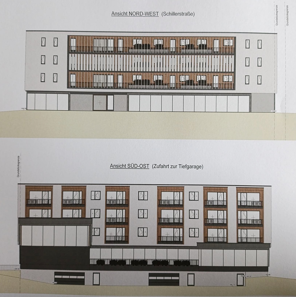 Bauweise: Die Tiefgarage wird in Stahlbetonbauweise errichtet. Auch der Tisch, auf dem die drei Etagen entlang der Schillerstraße stehen, wird in Betonbauweise errichtet. Sonst wird auf Holzbauweise gesetzt, sprich die Wohnungen werden komplett als Holzrahmenbau mit Massivholzdecken ausgeführt. „Für uns ist die Nachhaltigkeit und die Ökologie ein sehr großes Thema“, werde ein sehr energieeffizientes Gebäude geschaffen. Als Heizung ist eine Wärmepumpe mit Geothermietiefenbohrungen angedacht, so dass einerseits kostengünstig geheizt werden kann, doch auch kann im Sommer passiv gekühlt werden. Man verfolge einen klaren Standard, es sollen hochklassige Wohnungen werden. „Wohnanlagen, die wir für Eigentümer entwickeln, haben den selben Standard, wie diese geplanten Wohnungen, um auch in Zukunft auf dem Mietmarkt noch mitspielen zu können“, werde auch auf viele Kleinigkeiten geachtet: Geplant sind unter anderem Elektrosteuerungen, Verschattungen mit Raffstoreanlagen, Kühlung im Sommer, PV-Anlage auf dem Dach, Möglichkeiten für E-Mobilität. Hinzu kommen Fahrradgaragen, Stellflächen für Kinderwägen, ein zentrales Treppenhaus mit Aufzug. „Somit sind alle qualitativ hochwertigen Wohnungen barrierefrei und ebenerdig erschlossen!“