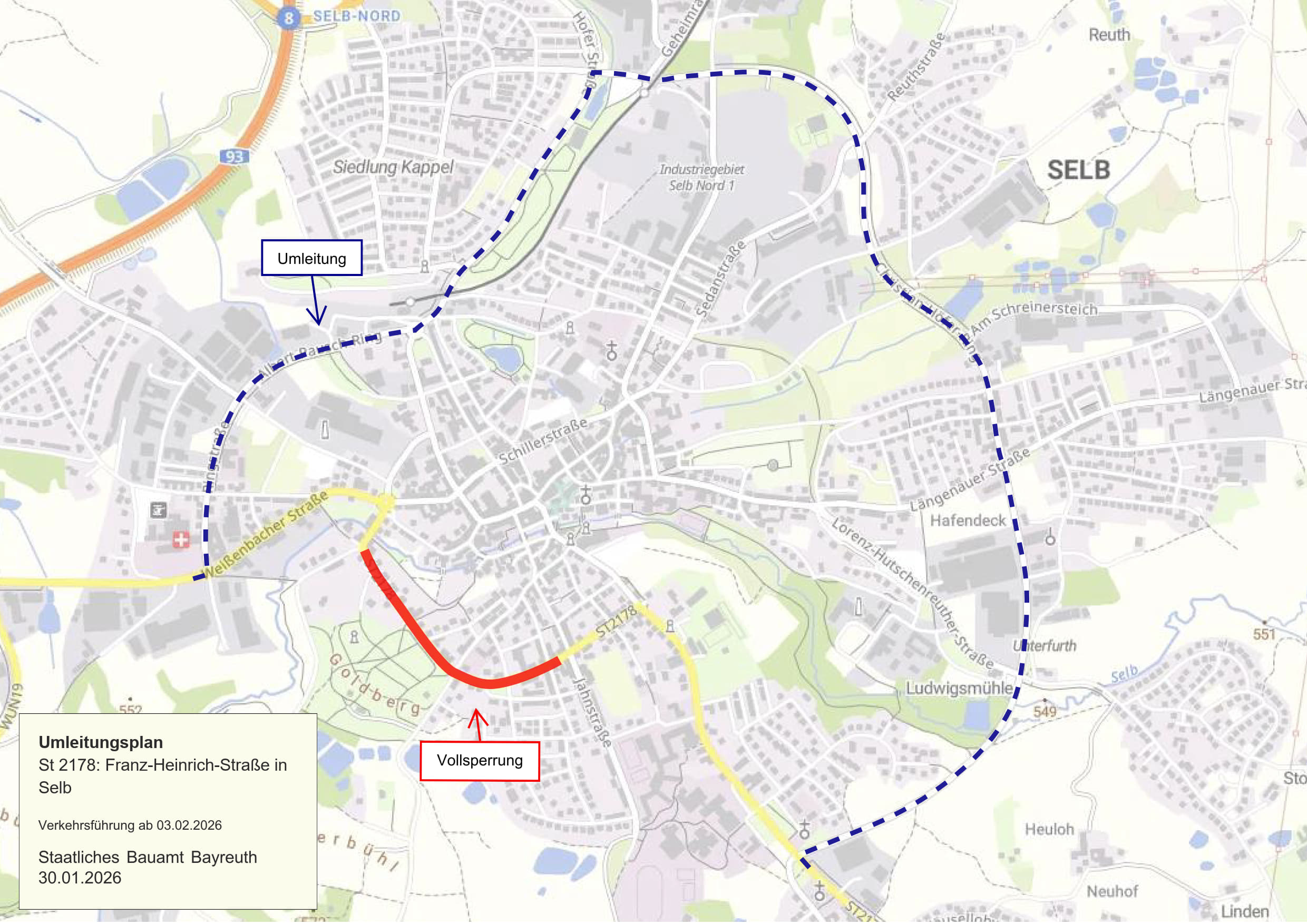 Der Verkehr wird von der Weißenbacher Straße (St 2178) über die Ringstraße, den Albert-Pausch-Ring, die Hofer Straße und den Christian-Höfer-Ring auf die Hohenberger Straße (St 2178) und umgekehrt umgeleitet.